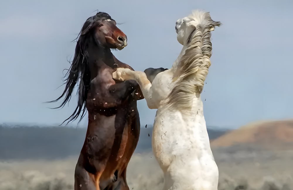 Deep within the arid plains, where the golden hues of the landscape blend seamlessly with the horizon, Danny Sullivan captures an enthralling dance of power and passion. Two majestic stallions, one dark as night and the other a shimmering white, rise on their hind legs, engaging in a breathtaking ballet.