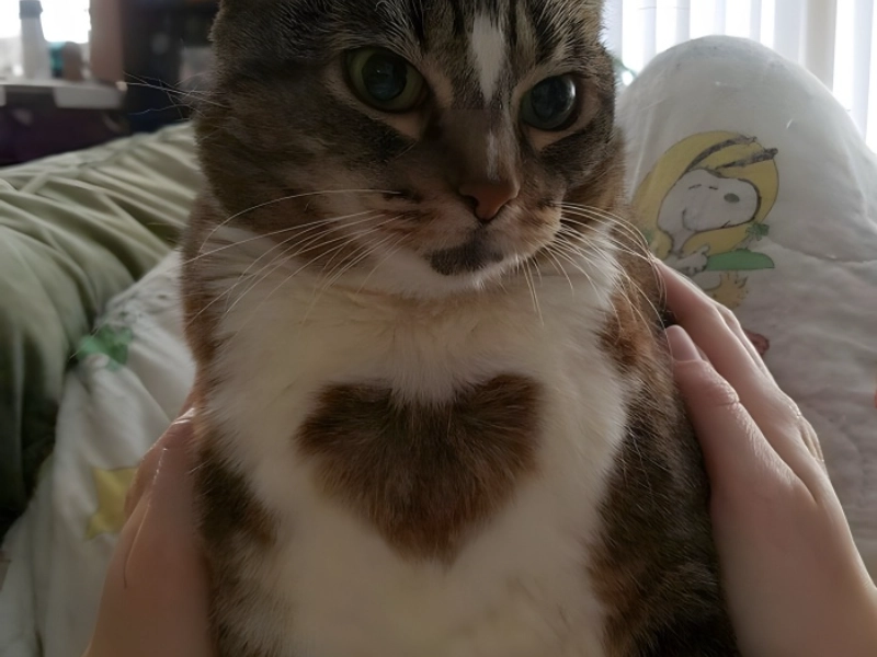 Despite its ostensibly unhappy attitude, this cat shows an extraordinarily big and clear heart-shaped design on its breast in a stunning exhibition of nature’s artistic capacity. Not only does this marking have ideal heart form, but also unparalleled size and prominence. Although dogs often exhibit heart-shaped patterns, they are quite unusual in cats so this particular feline is a remarkable find. Ironically matched with the cat’s generally displeased expression, the heart pattern dominates the chest area and creates a stunning contrast with its surrounding fur, providing a precisely proportional symbol of love. Among feline coat patterns, the marking is especially rare as its magnitude is rather amazing—almost the whole chest area. The cat’s grouchy attitude and the tender symbolism of the heart make an appealing and funny dichotomy that has surely helped to explain its internet popularity.