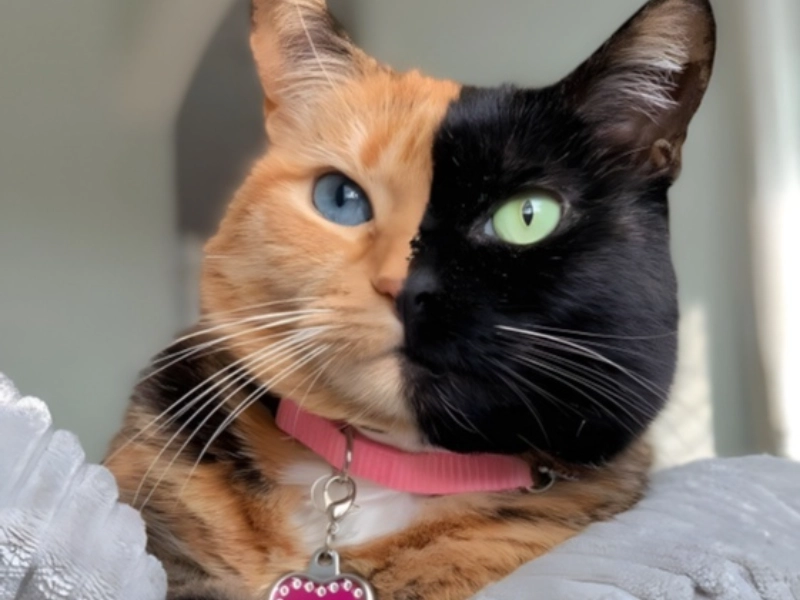 Venus is an amazing example of chimaera colouration; its face shows a flawless bilateral divide between black and orange fur, matched by heterochromia (different coloured eyes). Venus is especially unique even among chimaera cats because of its amazing mix of elements. The exact divide down the middle of the face and the different eye colors—one especially brilliant blue—have a strong visual impact. The way both colours stretch into the body with black dots among the mostly orange fur points to a complicated genetic mosaic. This cat is a remarkable illustration of how genetic chimerism can show itself in cats since the existence of heterochromia in combination with the split-face colouration offers solid proof for the chimeric character of Venus’s DNA.