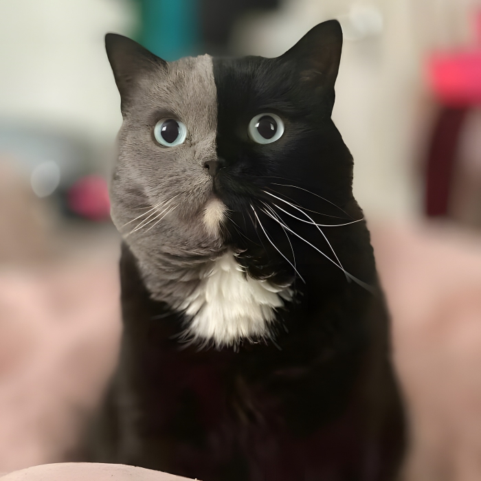 Here’s another feline with a chimera mutation. However, this one seems to only have two different patterns on its face unlike some of the other chimeras on this list. It’s eyes are also the same color. But we love the grey and black color combination and it’s split perfectly down the middle of this kitty’s face, which looks really cool. This cat also has a nice little white patch on its chest.