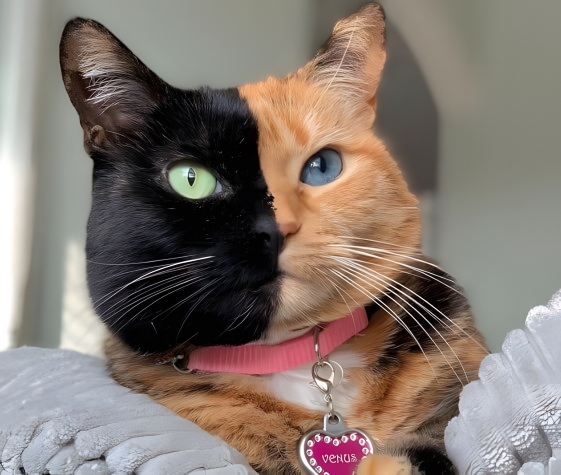 Here’s another unique cat with what looks like the chimera mutation. This cat, named Venus, has two different colors of fur on its face. Not only that, but it also has differently colored eyes, which look really cool. Half of its face is black and the other half is orange. It’s body is mostly orange but you can see patches of black everywhere, and we’re not entirely sure if it’s because of the mutation.