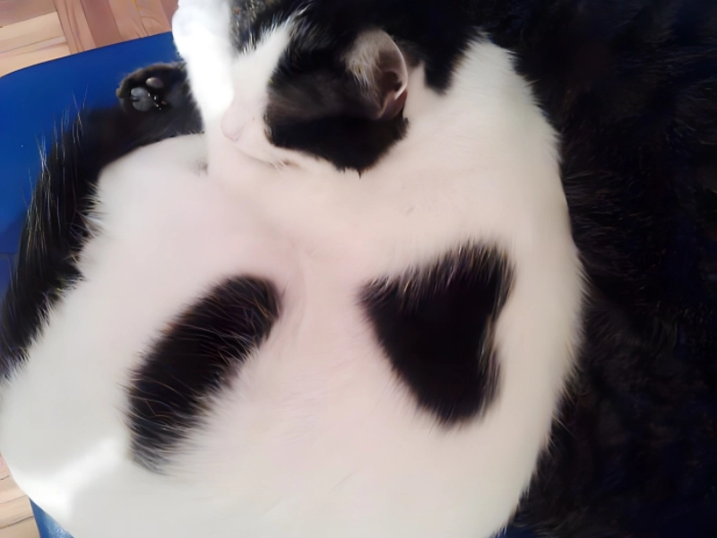 At first glance, this captivating image presents what appears to be a simple optical illusion, but closer inspection reveals a touching scene of feline affection. The initial focus naturally gravitates toward the striking white cat, but there’s more to this picture than immediately meets the eye. Upon careful observation, viewers will discover a black cat artfully entwined around its black and white companion, creating a beautiful tableau of feline companionship. The way these two cats have positioned themselves speaks volumes about the deep bond they share, demonstrating the tender moments of affection that can exist between these often independent creatures.