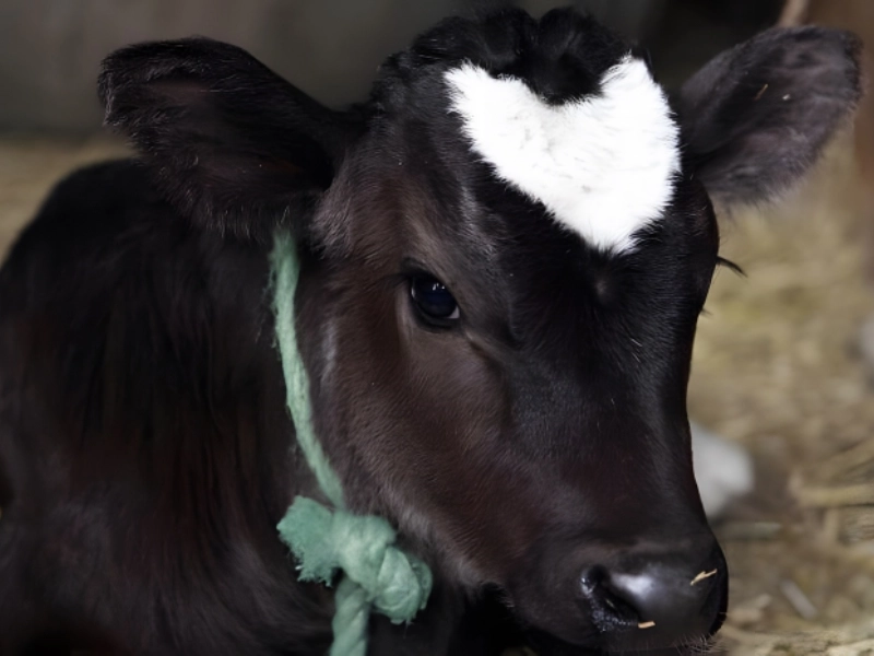 On the crown of its head, this tiny fella boasts a large white heart that stands out beautifully against its darker fur. The marking is so precise and symmetrical that it looks almost as if it were carefully painted on by an artist, yet it’s completely natural. This indicates that on its farm this calf will lead a contented life full of affection, as such a marking seems to predestine it for a life filled with love and care. This little one exudes nothing except positive energies, and its unique marking has likely made it a favorite among visitors to the farm, spreading joy and wonder to all who encounter it.