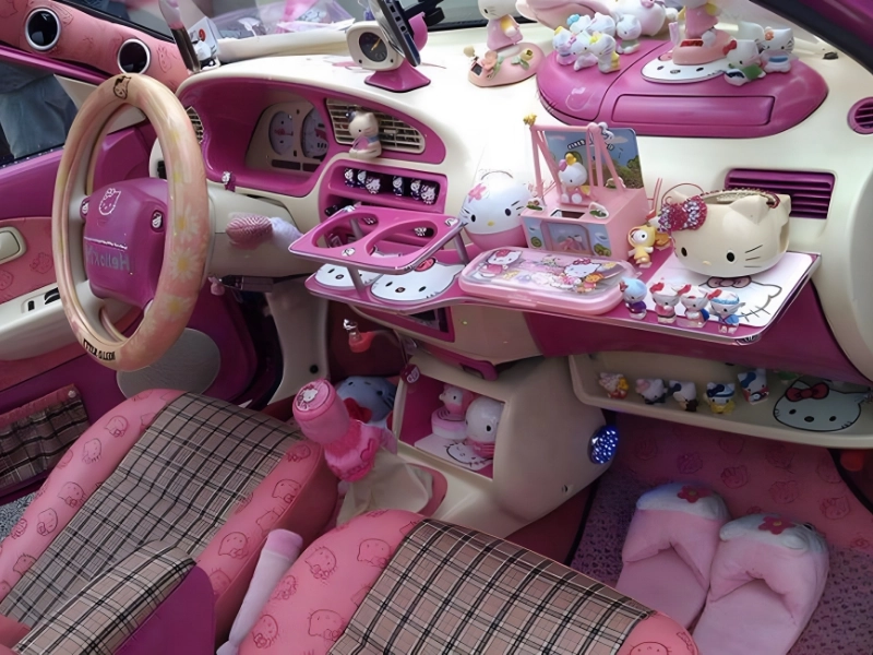 Hello Kitty has been around for a while—she debuted in 1974. Over the years, a sizable fan base for the tiny cartoon cat has persisted. Some fans are so devoted to the character that they have even painted their cars in its honor. This specific motor appears less like a car and more like a moving shrine.