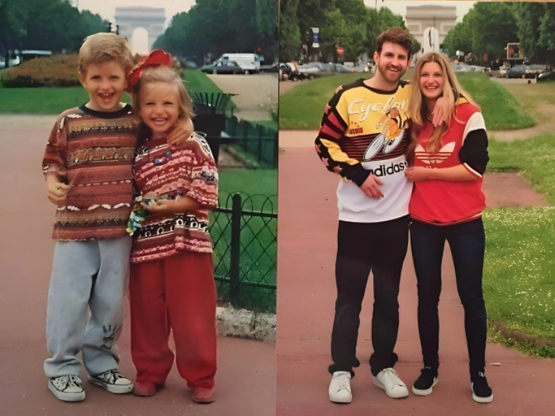 The first picture was shot on their family trip to Paris in 1995; the second picture was taken ten years later in Paris as well. Though they all grew up now, they obviously love one another.