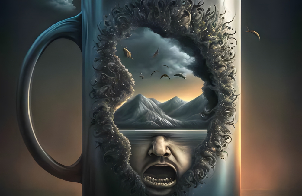 Want a surrealistic landscape with your morning cup of coffee? With AI art, you can have that. The exterior “frame” to this scene is a regular, large coffee cup, like one you probably have in your kitchen cabinets right now.