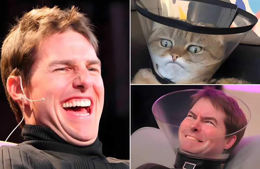 On the other hand, we have an angry-looking cat in a vet’s cone, likely recovering from some sort of medical operation (get well soon, kitty). Combine the two and voila! You have a subdued Top Gun actor in a plastic neck cone.