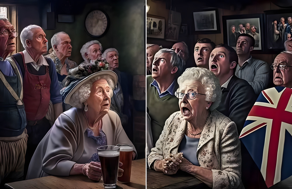 According to Midjourney, this is what the AI creator thought that the 2023 coronation of King Charles III would look like. We can see a bunch of older Brits gathered around a pub with their pints, staring at a TV screen raptly.
