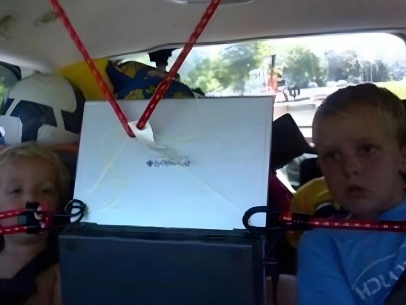 However, a good setup will probably cost you a few hundred dollars. Don’t you have any money left in the bank because those kids are eating up all of your money? Use bungee straps to secure a Sony portable DVD player to the car ceiling, then cross your fingers that you escape unscathed and don’t run into a Final Destination type of situation.