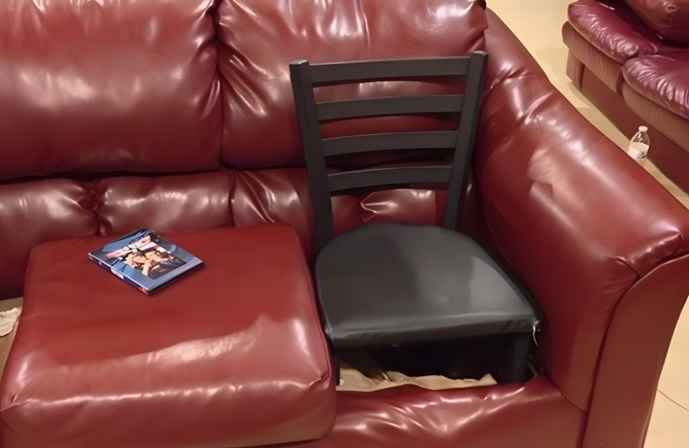 Rather see the bottom line take a hit by investing in a new one from Bed, Bath and Beyond, one Employee of the Month decided to save the day by shoving a dining chair in the sofa to fix the broken seat. Minus the cost of the chair and that’s a saving of a few hundred bucks.