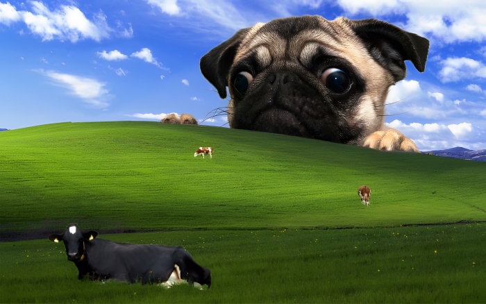 The pug looks confused at seeing a cow that is way smaller than him. But then again, pugs always look confused.