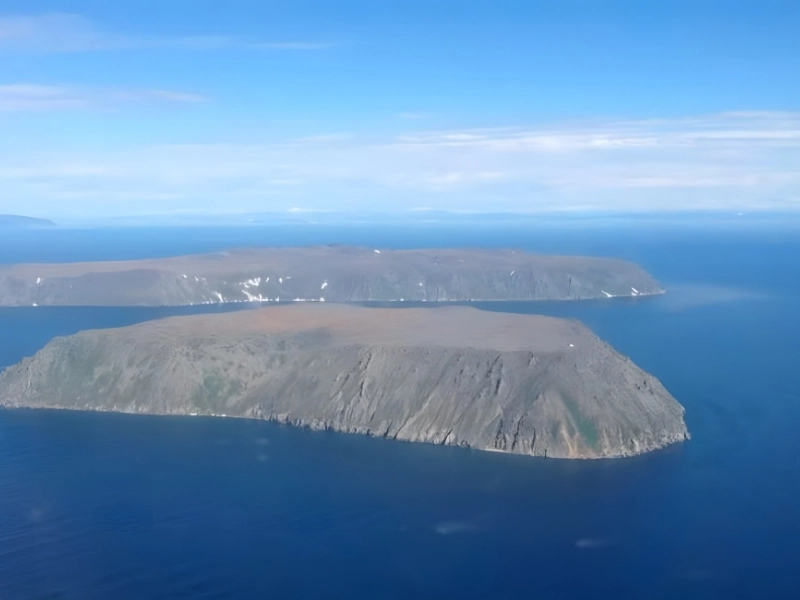 One of the most remarkable geographical contrasts between the United States and Russia is the Diomede Islands in the Bering Strait. The Russian territory of Big Diomede and the Alaskan territory of Little Diomede are divided not only by the International Date Line, which separates them by 21 hours, but also by a distance of only 2.4 miles (3.8 kilometers) of freezing waters.
