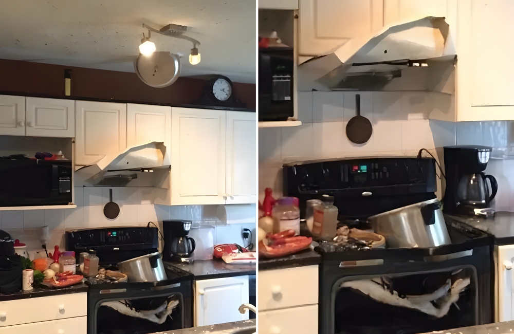 According to Zanes Law, pressure cookers can suffer from clogged or fused vents, damaged seals, faulty gaskets, and other maladies. And that, in turn, leads to an explosion like this one, which will take hundreds to fix (a new oven is necessary).