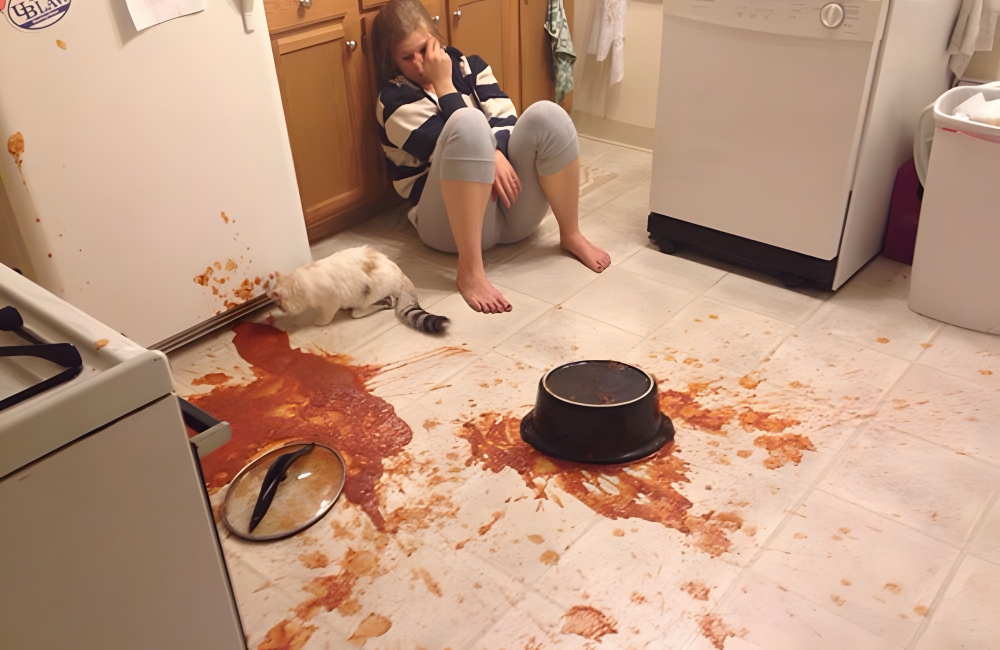 There’s nothing wrong with throwing in the towel and ordering out. This woman dropped her dish of sauce all over the floor, and the only one having a good time in this situation is her white, fluffy cat.