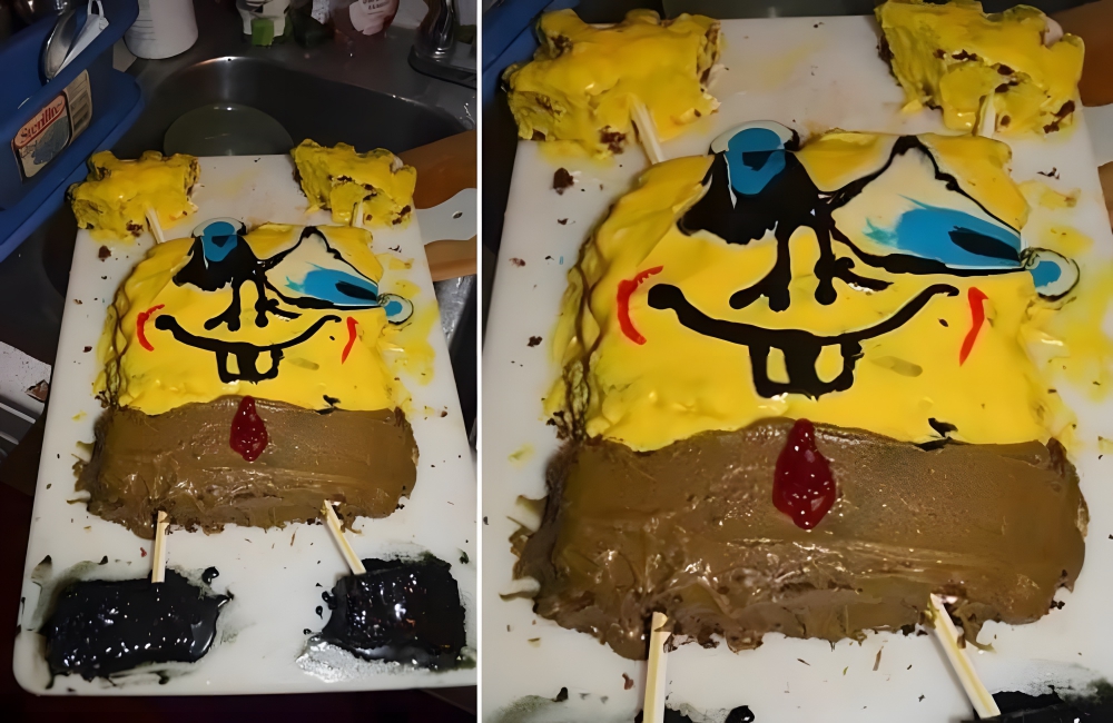This person loved Spongebob so much, they decided to turn him into a cake. What happened then was a sponge from hell. At the very least, it seems like this cake was frosted right after coming out of the oven—a big no-no.