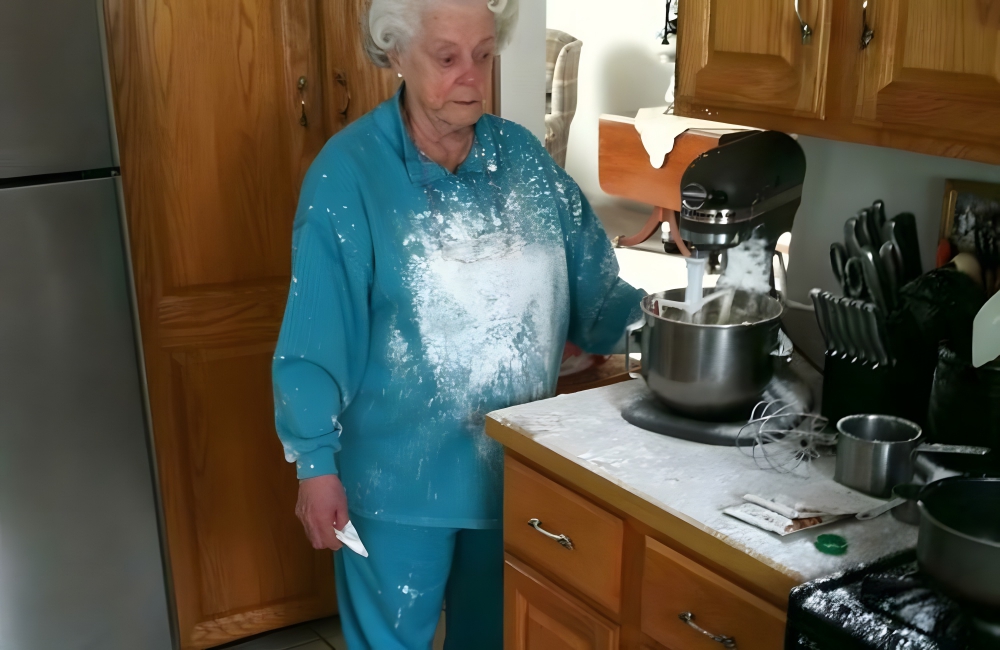 Grandma was having a bit of an issue with her stand mixer in this photo. Rather than cooperating, the stand mixer was blowing flour everywhere, not so much mixing as causing a huge mess.