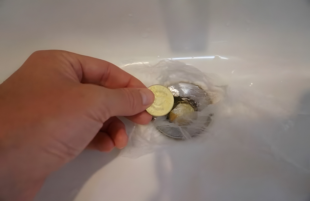 Once you place the plastic down in the sink, you can set the coins over the drain hole and the weight of the coins will hold the plastic in place, creating suction that will keep the sink basin full. This allows you to clean your clothes, or whatever else you need to wash, and is also easily reversible by simply removing the coins and plastic.