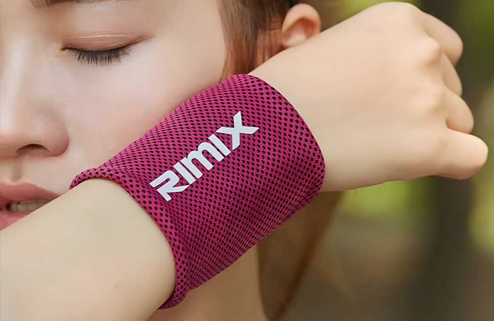 Try using a wrist brace like this Rimix band, which is made of a knitted mesh fabric that absorbs water. In addition to offering wrist support (helpful, especially if you’re lifting weights or doing pushups), you can also use it to wipe the sweat off your forehead, preventing drops from getting into your eyes and making your workout more difficult than it needs to be.