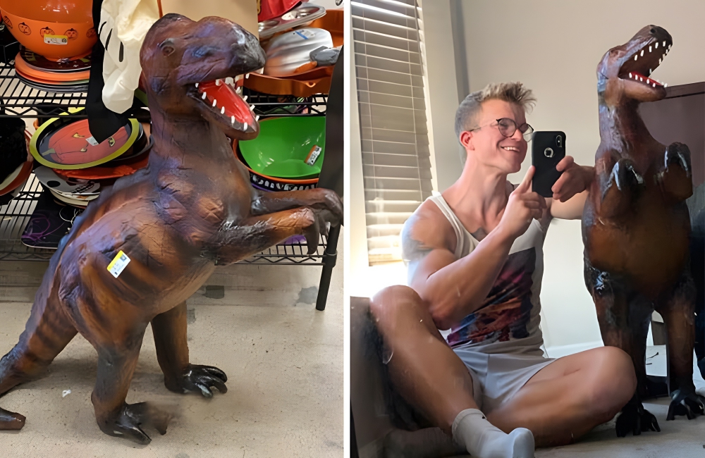 Giant Dino @boredpanda / PinterestAs the shopper, Zachary Bomer, said, “I’m buying this.” Bomer took a picture of himself seated next to his new dinosaur, and the two are the same height when he’s seated and the baby T-Rex is standing. We’re just jealous that he found the T-Rex first. Hopefully, other thrift stores will come into their own baby dinosaurs soon.