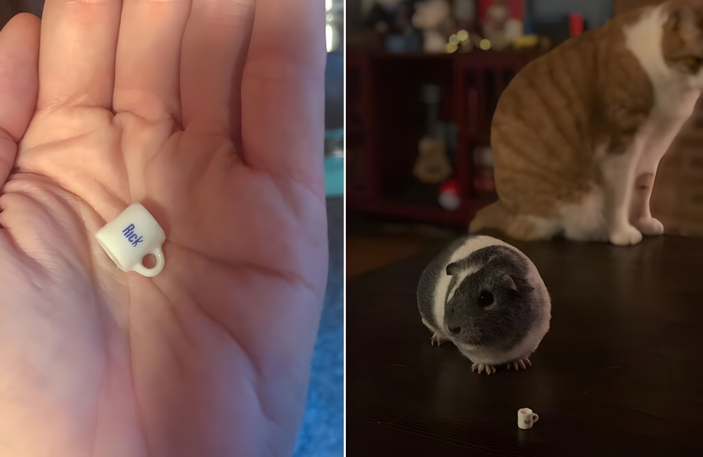 Rick’s New Mug @DLazuara / PinterestHelpfully, in the rest of the post, he added a few adorable size references. He placed the miniature cup next to his guinea pig, and it was too small even for that little animal to drink out of. He even posed the guinea pig and cup next to his disinterested cat.