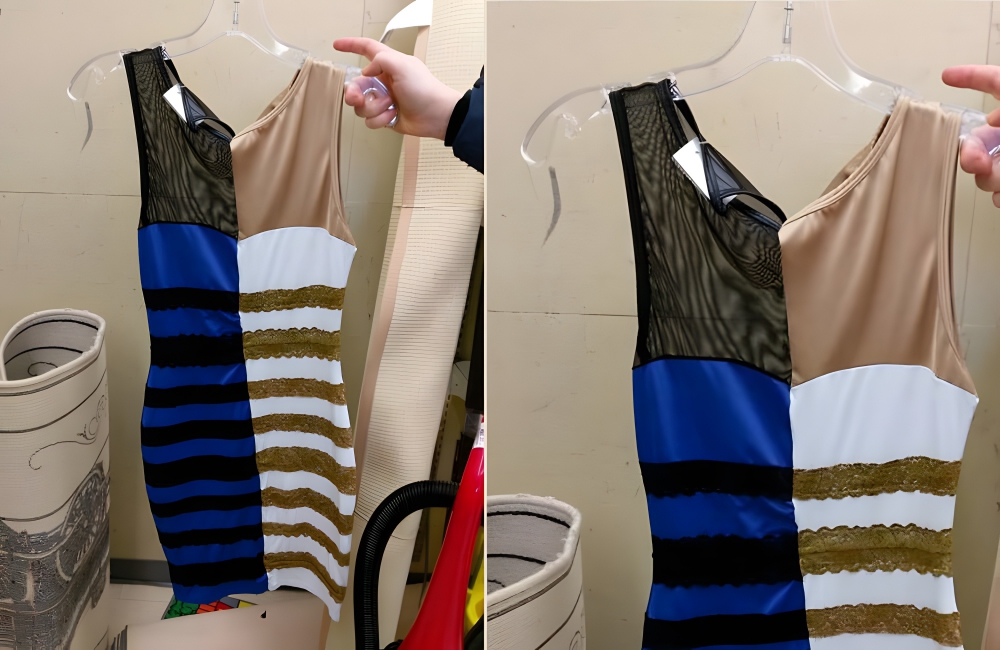 Found at: Unknown thrift storeEstimated Value: $5*A few years ago a picture of a dress circulated on the internet that had the world baffled. Was it white and gold or blue and brown? The dress became such a sensation that it even has its very own Wikipedia page to explain its impact. It looks like someone decided to capitalize on that by creating this very contrasting design.
