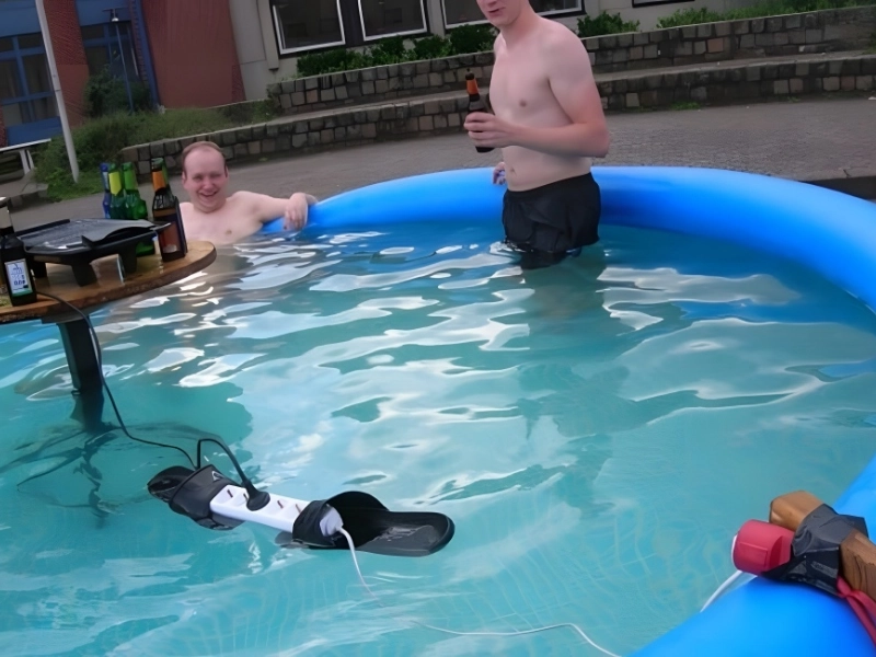 Every now and then, an image appears on the internet that has global repercussions. We’re not discussing ice caps melting here; instead, three guys were sitting in a pool and powering a stereo with an extension wire.