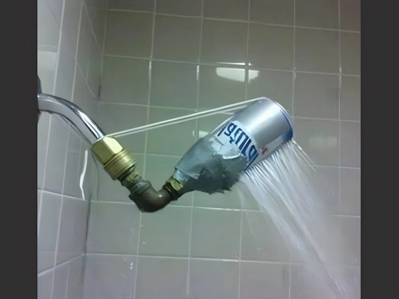 Evidently, a homeowner decided it would be easier to simply poke a few holes in a can and attach it to the pipe. It’s undoubtedly an inexpensive fix compared to the $149 it costs to have a new shower head installed, but it won’t stay forever.