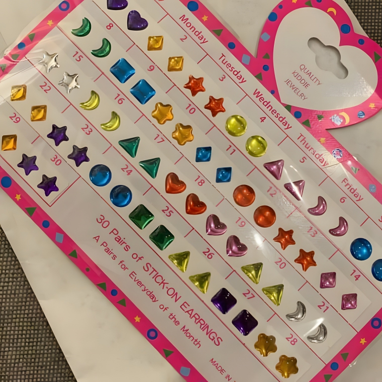 There really was nothing better than opening up a fresh pack of stick-on earrings that came with a pair for every day of the month. Monday? Time to stick on a yellow star earring. Tuesday? Let’s go for the blue heart. Every morning was like a mini-game show where you’d try to match the right earring with the correct day of the week- but you were lucky if these actually stayed on for half the day.