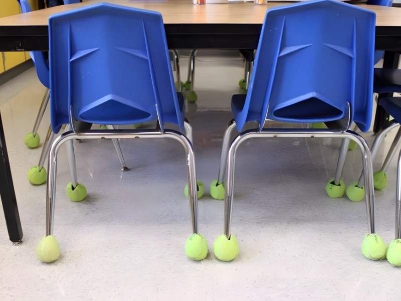 If you’ve ever visited an elementary school, you’ve probably seen tennis balls on the legs of chairs, tables and whatever other furniture there in the premises. That is because the linoleum floor is very easy to scratch (especially when there are a lot of youngsters running around), and tennis balls keep the bases of table and chair legs from leaving marks.