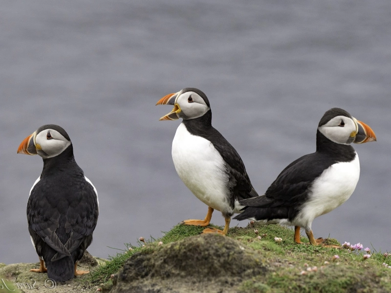 Duck family members, puffins are tiny birds with sharply serrated beaks. Puffins dive up to twenty meters with remarkable skill.
