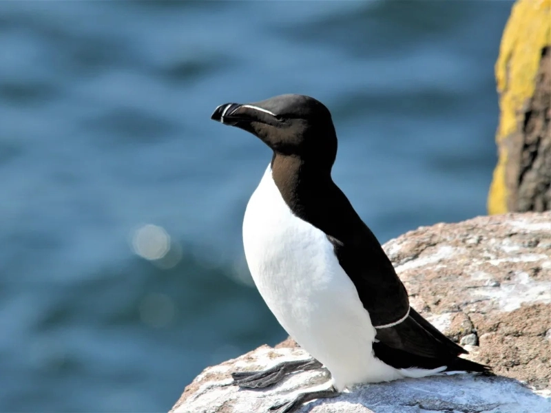 Auks are little seabirds that can reach a maximum body length of 35 cm and a maximum wingspan of 50 cm. These birds are easily recognized by their large, rounded beaks. Auks are exceptional divers; they can swim underwater by using their wings, and they can steer with their legs.
