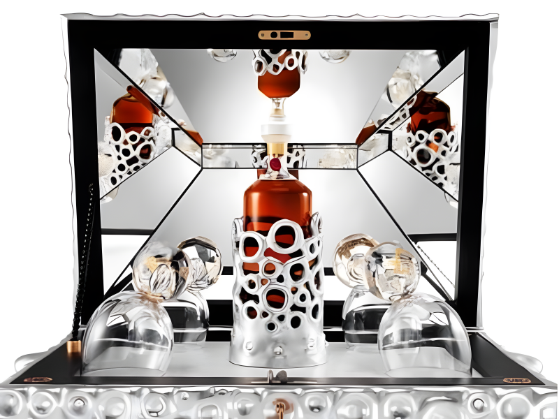 The bottle itself is a marvel of design. Mirrors are strategically placed around the cognac within the bottle, creating a mesmerizing visual effect. These mirrors serve to enhance the rich, amber hues of the cognac, allowing light to play off the liquid in captivating ways. This interplay of light and reflection turns the bottle into a dynamic visual piece, changing its appearance depending on the viewing angle and lighting conditions.
