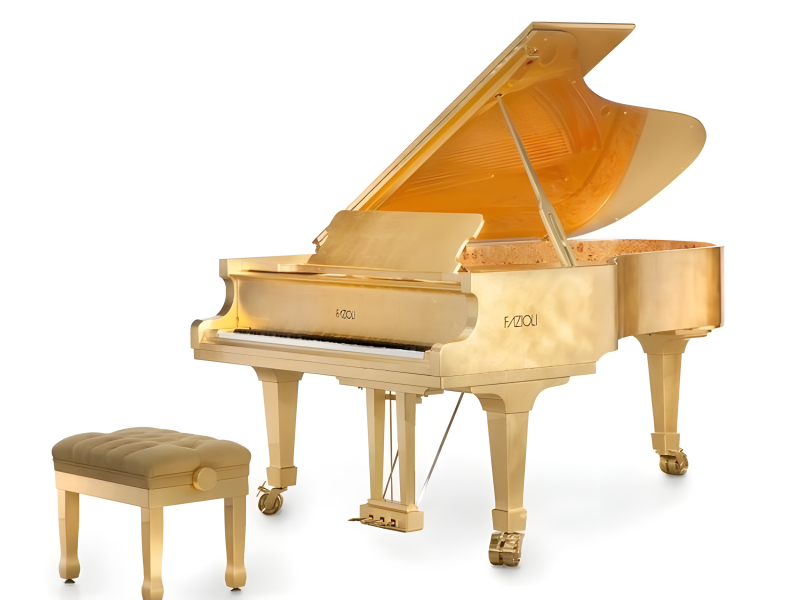 When it comes to the priciest grand pianos available worldwide, the Fazioli Gold Leaf model is unavoidable. This piano is hand-adorned with 20-carat gold leaf, based on the F228 model. The gold is shielded by a unique polyester coating, which keeps the instrument shining and resistant to scratches.
