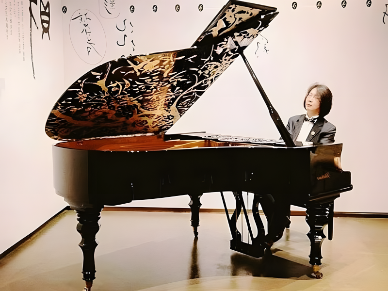 For more than 160 years, the venerable brand Blüthner has been creating some of the most exquisite grand pianos on the planet via innovation. They have produced a one-of-a-kind gold-inlaid masterpiece. Black wood makes up the lid, which has internal ornamentation. An incredible gold picture is visible when the piano lid is lifted.