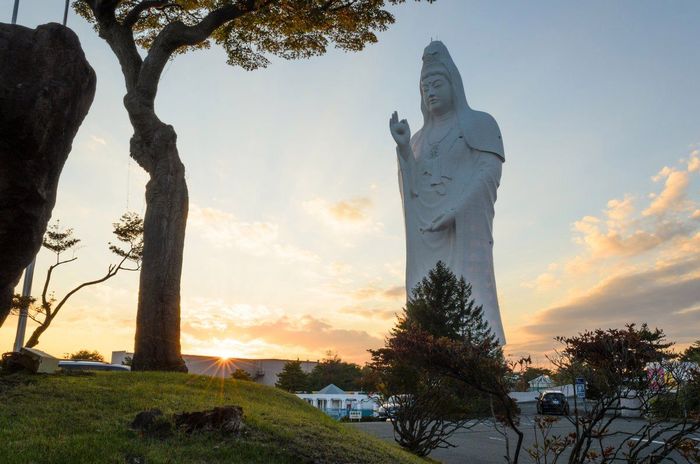 The statue of the Goddess of Mercy, Kannon, in Sendai, Japan. The 100-meter-tall statue was built in 1991.