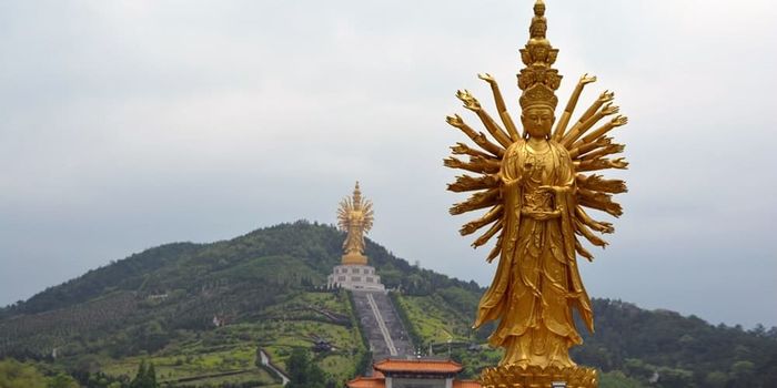 A bronze statue of Avalokiteśvara, located in Hunan, China. The monument was constructed in 2009. A Buddhist legend has it that Guanyin vowed not to rest until all living beings were liberated from samsara, the cycle of birth and rebirth. She initially had 11 heads and discovered her hands breaking while reaching out to help those in need. Amitabha came to her aid and gave her a thousand hands.