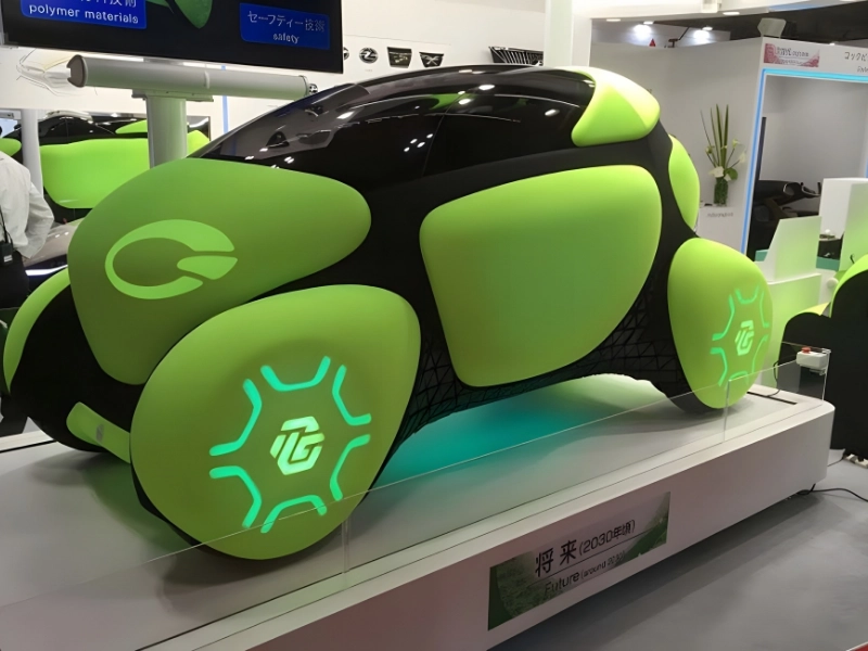The rubbery exterior is made of a proprietary polymer called “e-rubber,” according to Toyoda Gosei. The skin of the car is “activated” when the driver is in a collision. The interior of the car is almost cocoon-like, with a soft lining. Electrical currents run through the exterior, and it’s assumed the car will run on electricity as well. Gosei imagines it will be on lots by 2030.