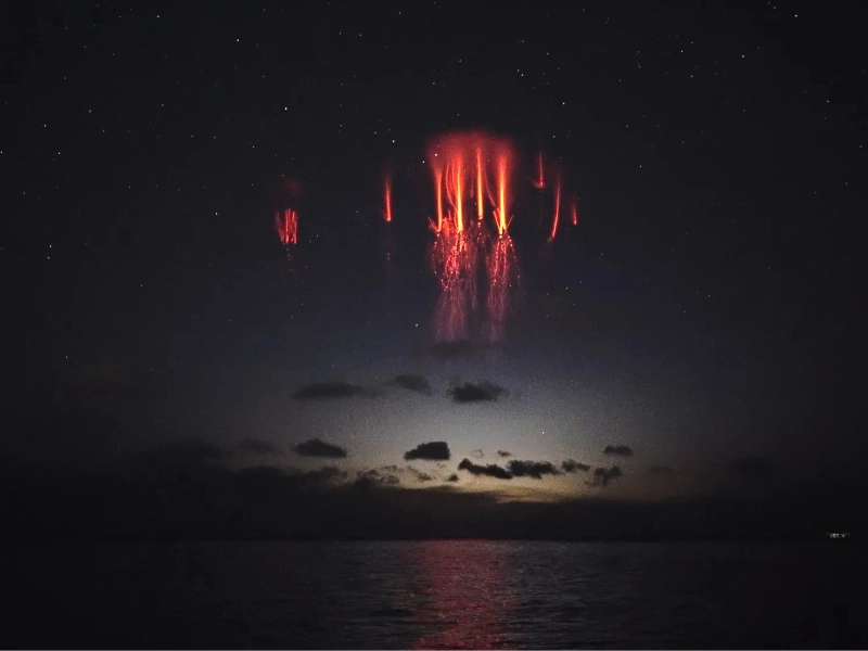 Although the phrase “red lightning” is used generally, there are really several different kinds of high atmospheric visual events falling under this category. Usually found as a cluster of reddish-orange tendrils rising from the top of thunderclouds, the sprite is the most often occurring type. Columnar, carrot-like, or jellyfish-like forms are just a few of the several shapes sprites can adopt. Another kind shows as fast growing rings of red light: the ELVES (Emission of Light and Very Low Frequency Perturbations due to Electromagnetic Pulse Sources). Although these circular events stretch hundreds of km in diameter, they are difficult to see with the unaided eye since they endure just a fraction of a second. Though not red itself, blue jets commonly accompany red sprites and show up as blue cones of light emanating skyward from thundercloud tops. Larger forms of blue jets, giant jets can reach even greater altitudes and occasionally link the ionosphere to the cloud tops. In terms of form, duration, and altitude, every one of these events has special qualities that add to the interesting and complicated realm of high atmospheric electricity. New forms of upper atmospheric discharges, such “gnomes” and “pixies,” are still being found by researchers, thereby broadening our knowledge of the several family of brief luminous occurrences occurring above thunderstorms.