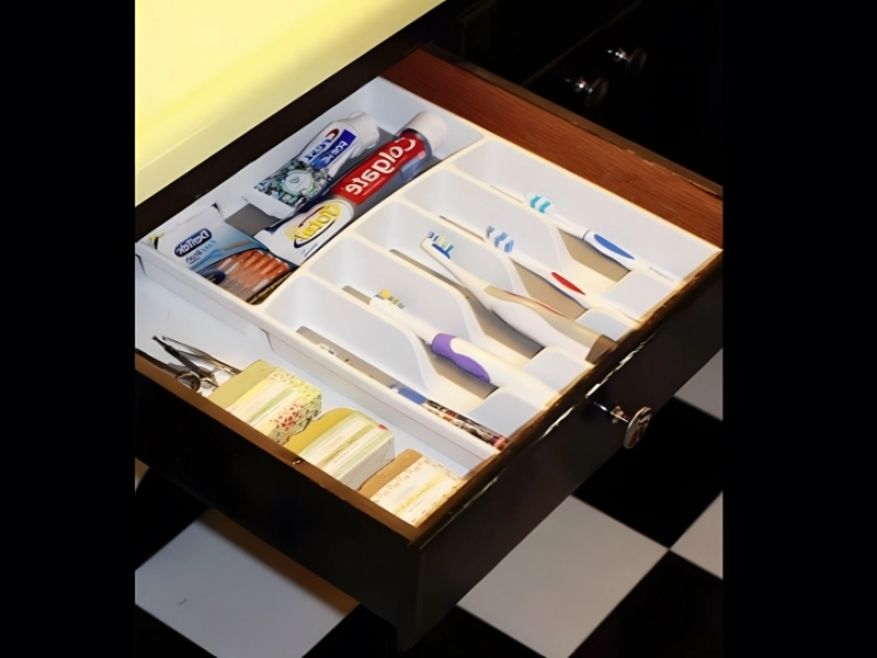 The restroom is included in this. Every drawer needs to be organized, and you can easily turn your silverware organizer into a toothbrush holder and an organizer for all of your various bathroom supplies. Additionally, they’re reasonably priced; silverware organizers may be purchased for between $1 and $5 at nearby dollar stores. They don’t need to be elaborate because you will be storing them in a drawer.