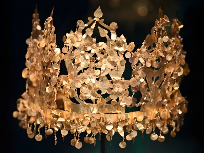 Twenty thousand ornaments made of gold, ivory, silver, and other precious metals made up the trove. They were found in the burial mounds of five ladies and one man, who were probably all important figures in first-century A.D. society. The Scythian gold artifacts, found on the shores of the Bosphorus and Chersonese thousands of miles away, are the closest objects to these.