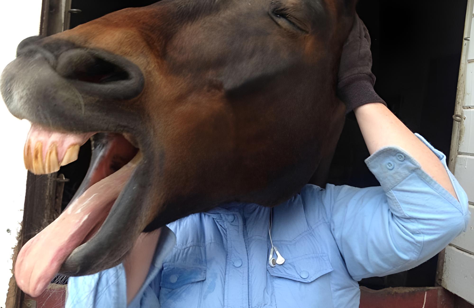 As much of a draw as a horse-headed farmer would be, sadly, they don’t exist. This is just a well-timed picture of a horse enjoying every second of its time with its handler.