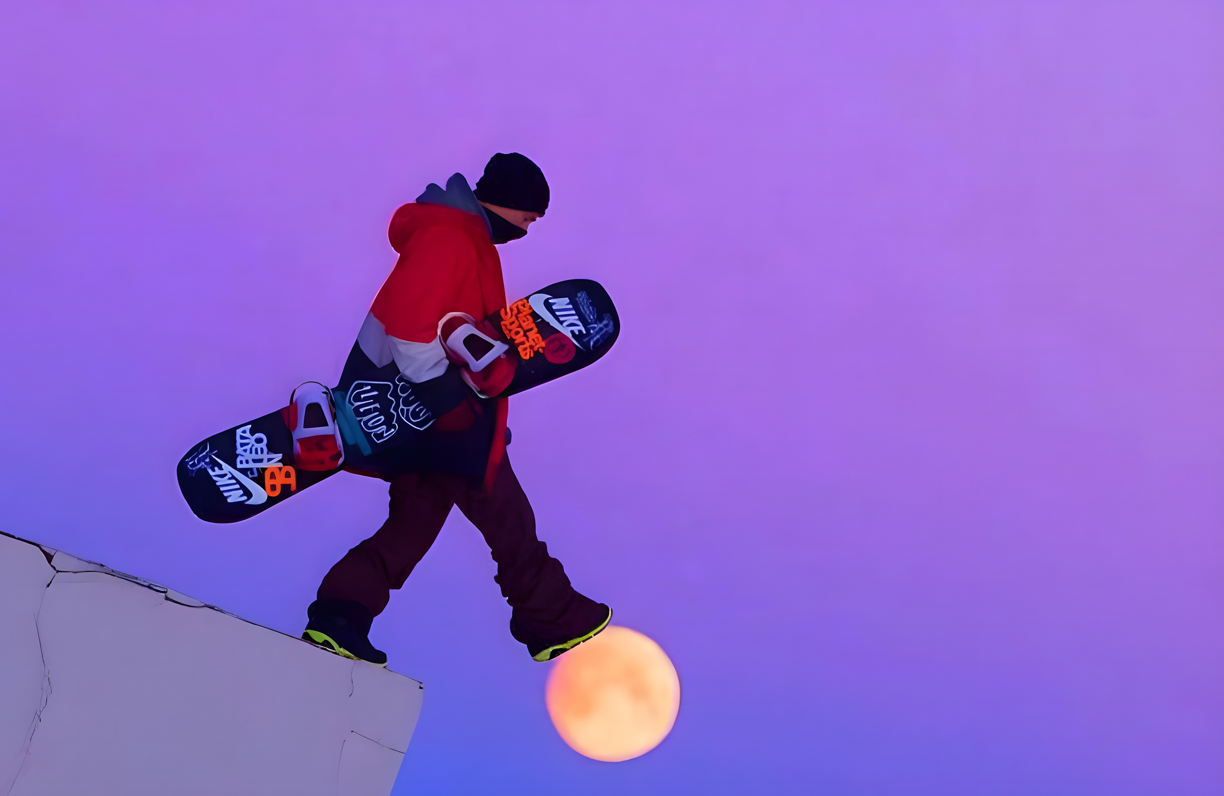 In a scene reminiscent of Indian Jones’ walk across the bridge at the end of The Last Crusade, this snowboarder appears to take a “leap of faith” by walking on the moon. That’s what we’d call “one giant leap.”