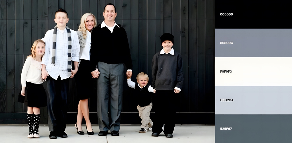 The versatility of black and white means that you can use this family photo color scheme in any season. For example, in summer, you can dress everyone in brightly colored clothes and convert the photo to black and white. This will create a beautiful contrast between the colors of your clothing and the black-and-white background.