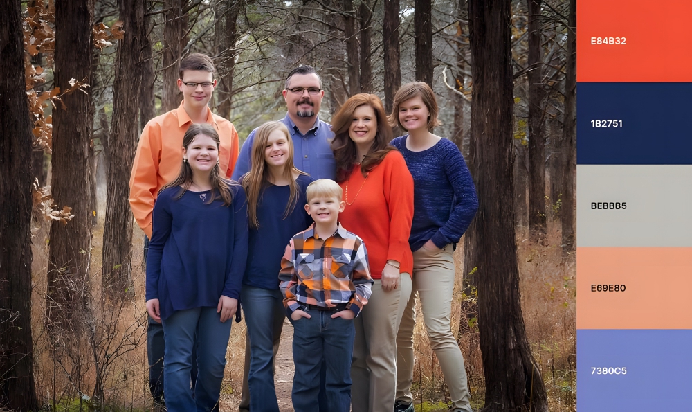 When choosing this family photo color scheme,avoid using too much orange, as it can be overwhelming. Blue should be the dominant color, with only a few pops of orange throughout the photo.