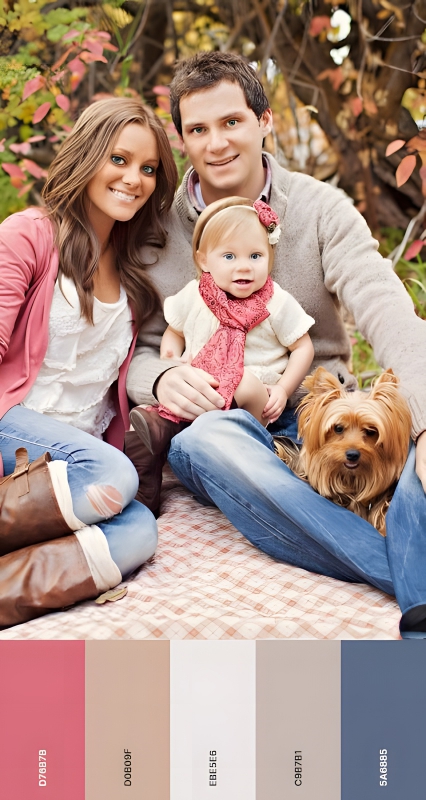 Pink, tan, and cream create a light, soft color scheme suitable for family photos when you want to draw attention from a busy background. The cream helps to brighten up the pictures, while the pink and tan add a touch of femininity.