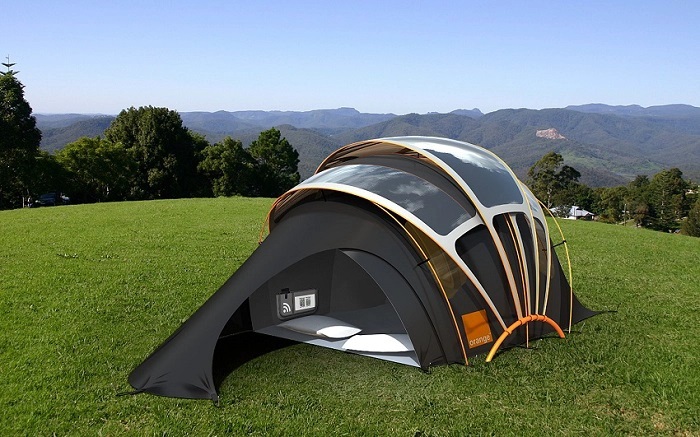 In addition to its main purpose, the Orange Solar Tent is able to accumulate solar energy during the day using photovoltaic cells that are part of its frame. The resulting current can be used to illuminate the “home” in the dark or to charge gadgets.