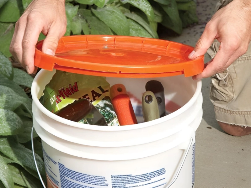There are many tips that gardeners provide on how to make yard work easier, and this one is quite clever. You can put the cover on a five-gallon bucket to keep equipment dry from rain, which makes it a great container for holding tools.