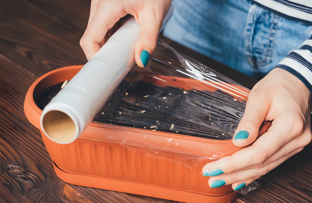 The same plastic wrap (also known as Saran wrap or cling film) that you use in your kitchen might also have benefits in your garden. This film holds in heat and moisture, making it a great tool if you’re looking to get a greenhouse effect with your plants.