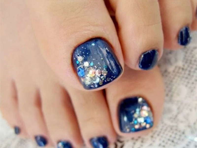 The base coat comes on after the toes are ready. The galaxy design is built on a dark finish usually black or deep navy. Real artistic ability starts as the base coat dries. The nail artist will dab on several colors—purple, blue, and pink—using a sponge, mixing them together to produce a whirl effect that mimics the night sky. Adding glitter or holographic polish will improve the design and provide a glittering quality that replics the twinkling stars.