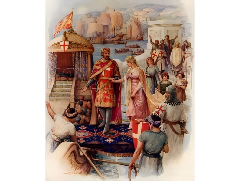 He stopped to pick up an unexpected gift on the way. After overthrowing the insane tyrant who had been the Emperor of Cyprus, Richard I claimed Cyprus for England. Richard sent the overthrown Emperor a gift for his future bride after he had him wrapped in chains made of gold and silver.